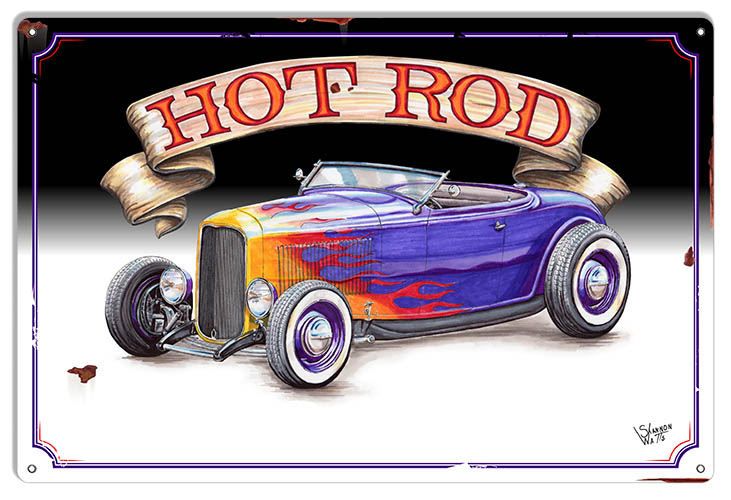 Blue Hot Rod With Flames By Artist Shannon Watts Metal Sign. 12×18 .040 Aluminum. This Sign Has Eyelets For Mounting. Made In The USA.These Signs Are Custom Made To Order Please Allow 1 Week For Shipping.