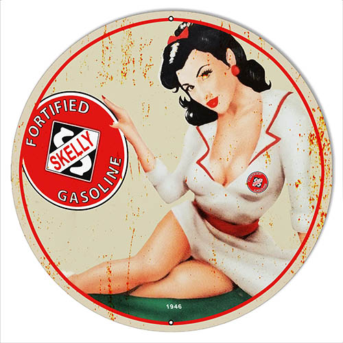 Fortified Skelly Gasoline Pin Up Girl Vintage Metal Sign. 14″x14″ 24g Steel. This Sign Has Eyelets For Mounting. Made In The USA. Please Allow 1 Week For Shipping.