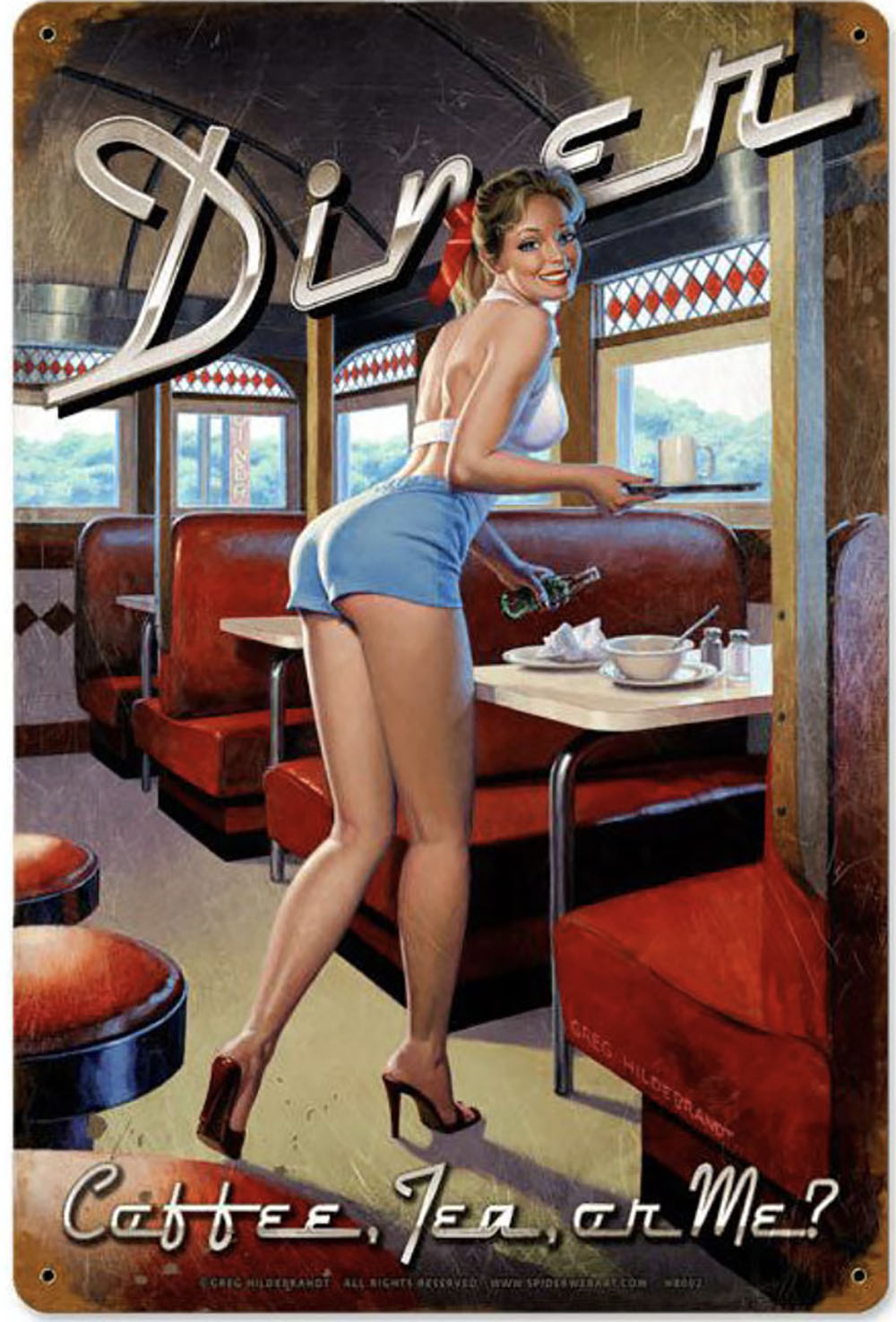 From the Greg Hildebrandt licensed collection, this Diner Vintage Metal Sign measures 12 inches by 18 inches and weighs in at 2 lb(s). This vintage metal sign is hand made in the USA using heavy gauge American steel.