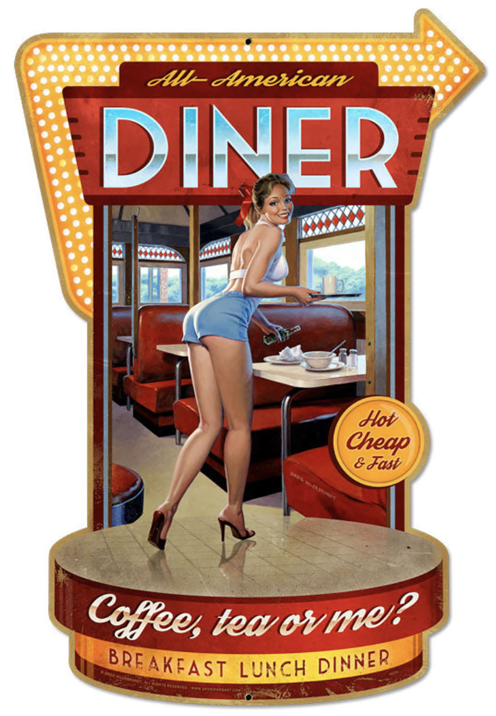 Diner Plasma Metal Sign from Greg Hildebrandt’s American Beauties. 21″x30″, 8 lbs, handmade in the USA with heavy-gauge steel and sublimated finish.