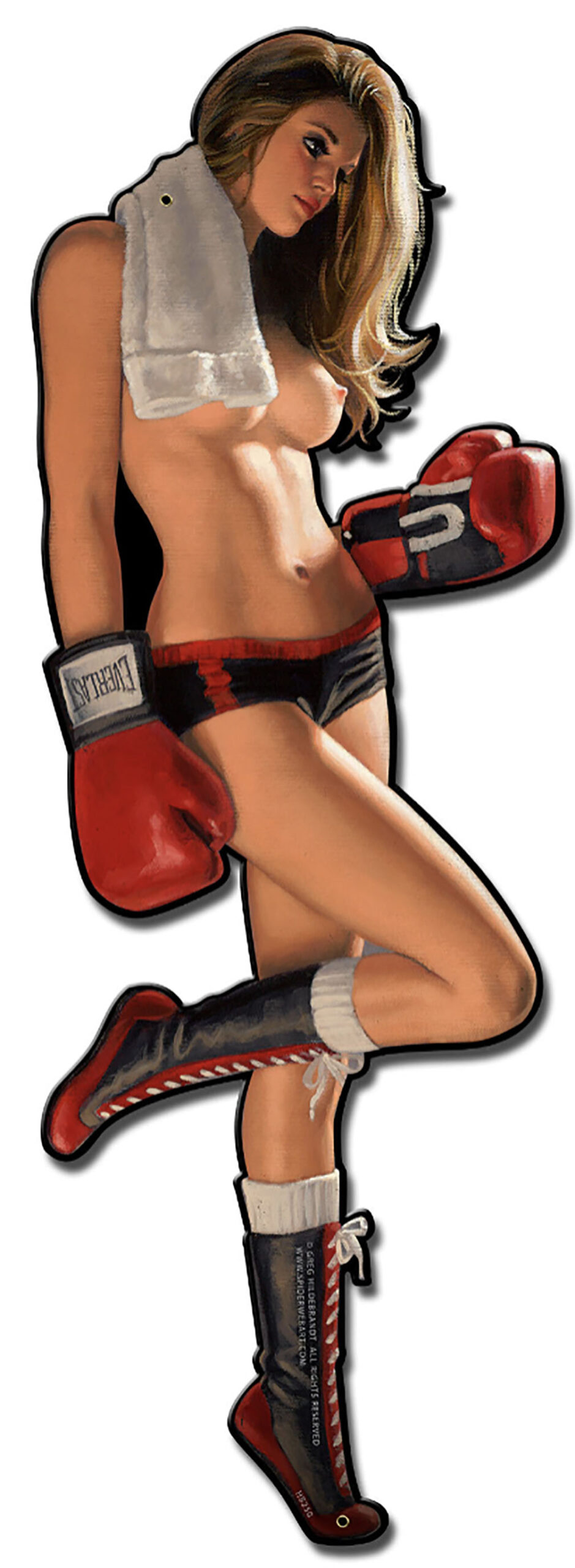 This Boxing Girl custom shape sign from the American Beauties licensed collection by Greg Hildebrandt, measures 12 inches by 34 inches and weighs 4lb(s). This sign is hand made in the USA using heavy gauge American steel. Sign Has Eyelets For Mounting. HB251