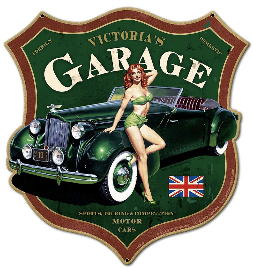 Victoria’s Garage Vintage Metal Sign (HB293) from Greg Hildebrandt’s American Beauties Collection. Handmade in the USA from heavy-gauge steel, 15″ x 16″ and 2.30 lbs, with eyelets for easy wall mounting.