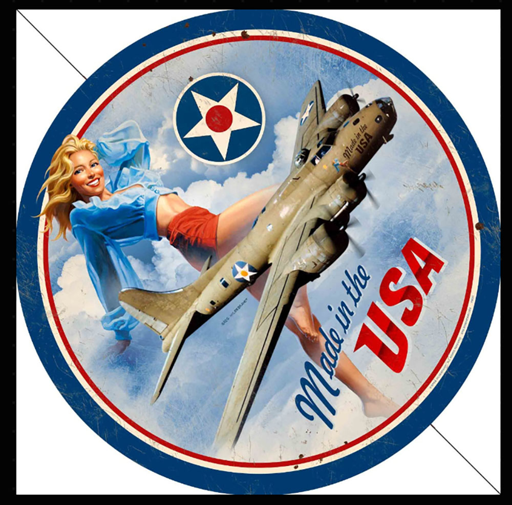 HB316 – From the Greg Hildebrandt American Beauties licensed collection, this vintage sign – USA B17 18 GAUGE Metal sign measures 46 inches by 46 inches and weighs in at 26 lb(s). This vintage metal sign is hand made in the USA using heavy gauge American steel.