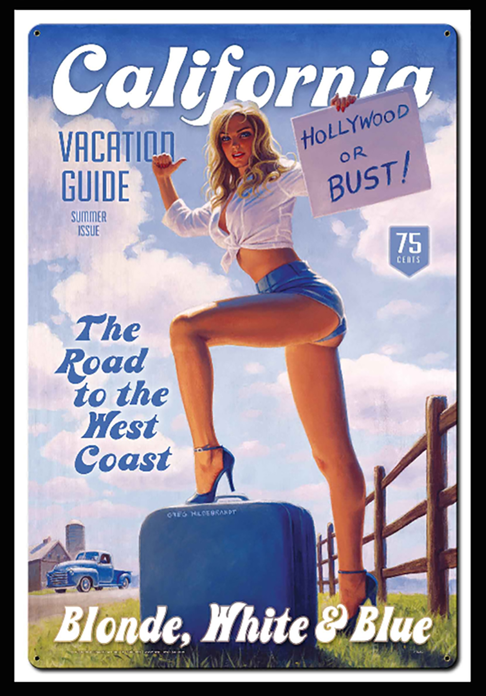 From the American Beauties licensed collection by Greg Hildebrandt, this ‘Blonde White and Blue Vintage Metal Sign’ measures 12 inches by 18 inches and weighs in at 2.07 lb(s). This metal Sign is hand made in the USA using heavy gauge American steel.
