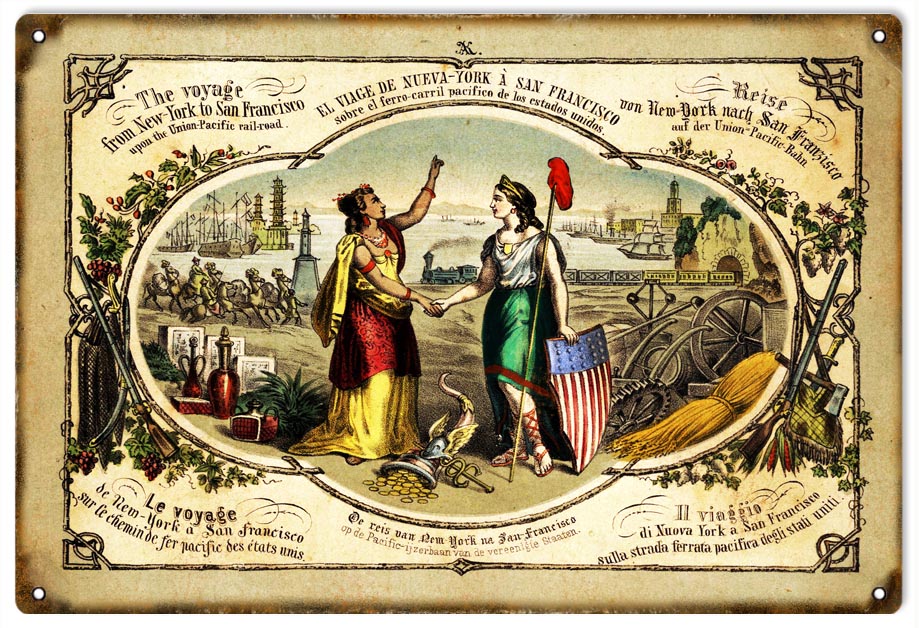 Reproduction Aged Looking The Voyage From New York To San Francisco Upon The Union Pacific Railroad Sign. 12″x18″ .040 Aluminum. This Sign Has Eyelets. Made In The USA.