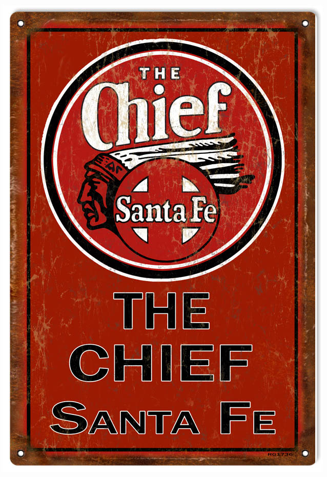 Reproduction Aged Looking The Chief Santa Fe Railroad Sign ( Red). 12″x18″ .040 Aluminum. This Sign Has Eyelets. Made In The USA